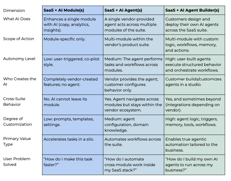 AI agent builders represent the outer degree of AI infusion inside SaaS platforms. Instead of relying on vendor-provided agents, customers can design and deploy their own agents using the platform’s data, tools, and workflows. This shifts AI from something you use to something you create. It turns the product into an environment for defining how agents should reason, act, and move through multi-step work.